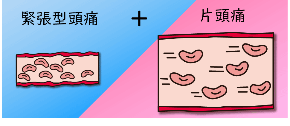 筋肉が収縮することでおこる緊張型頭痛と、血管が拡張することでおこる片頭痛が混在するケースです。